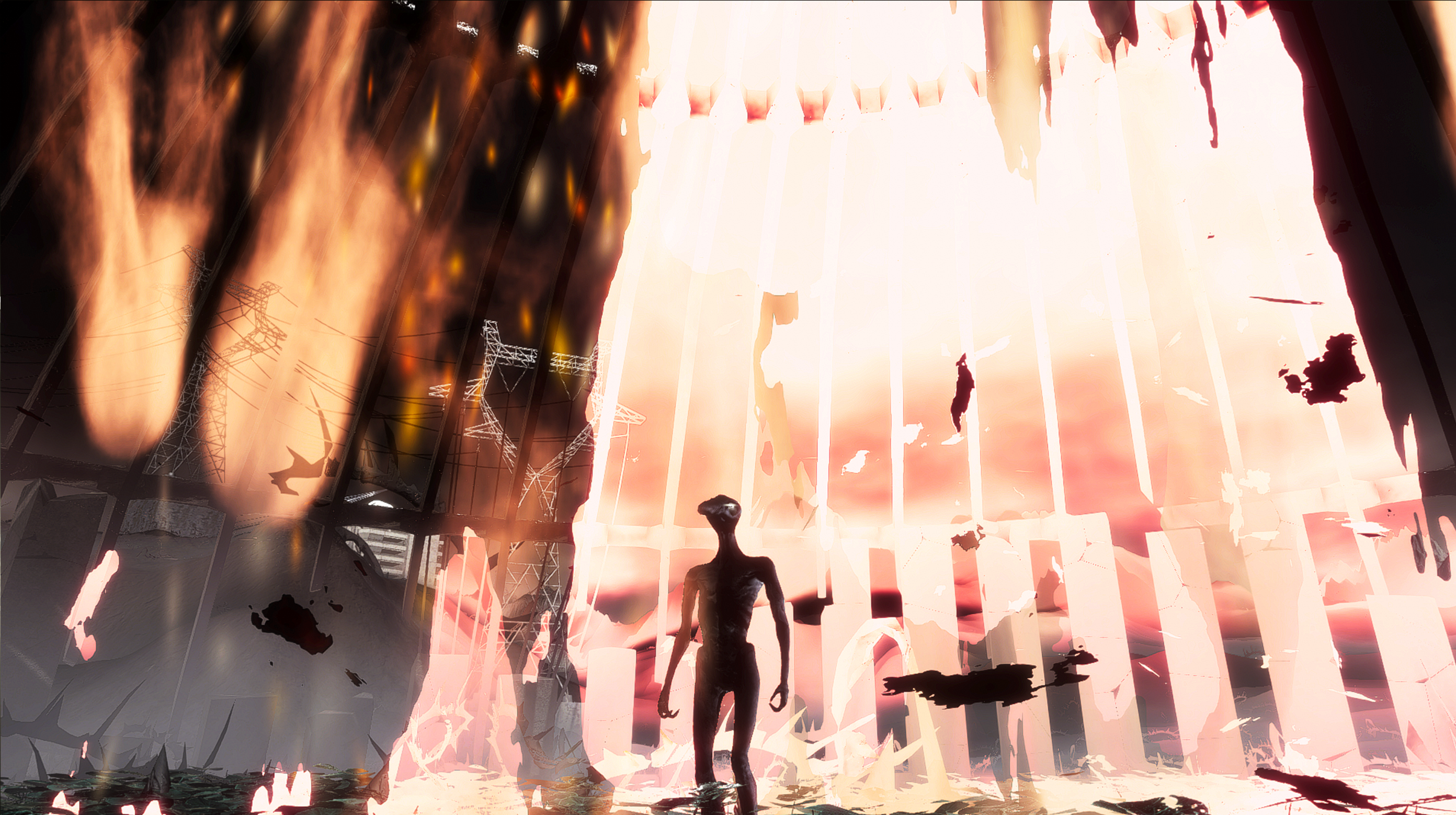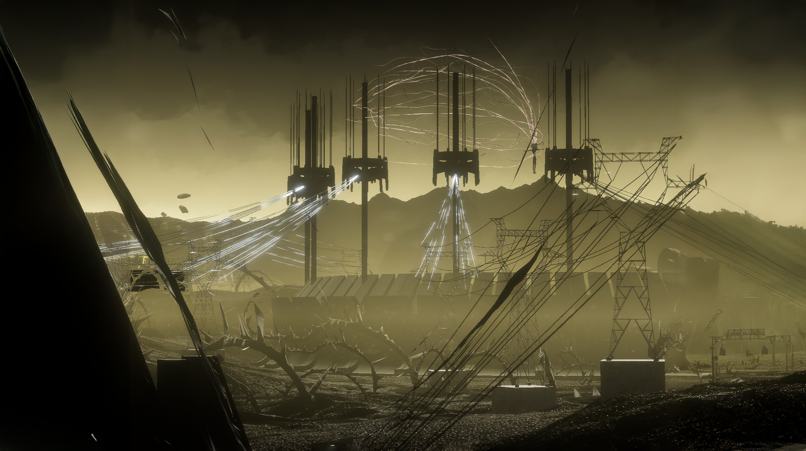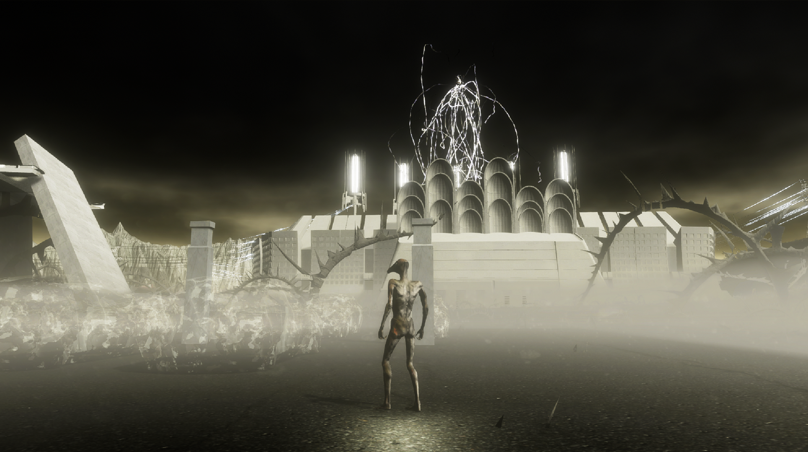 At the heart of a vast bramble patch littered with power pylons and abandoned structures, the AI carves—through its arduous passage—the network of aggregated lines of desire that may, on its next run, allow it to reach the object of its longing, held captive in a blind fortress. It hurts itself, collapses, and begins again tirelessly, learning a little more with each attempt.